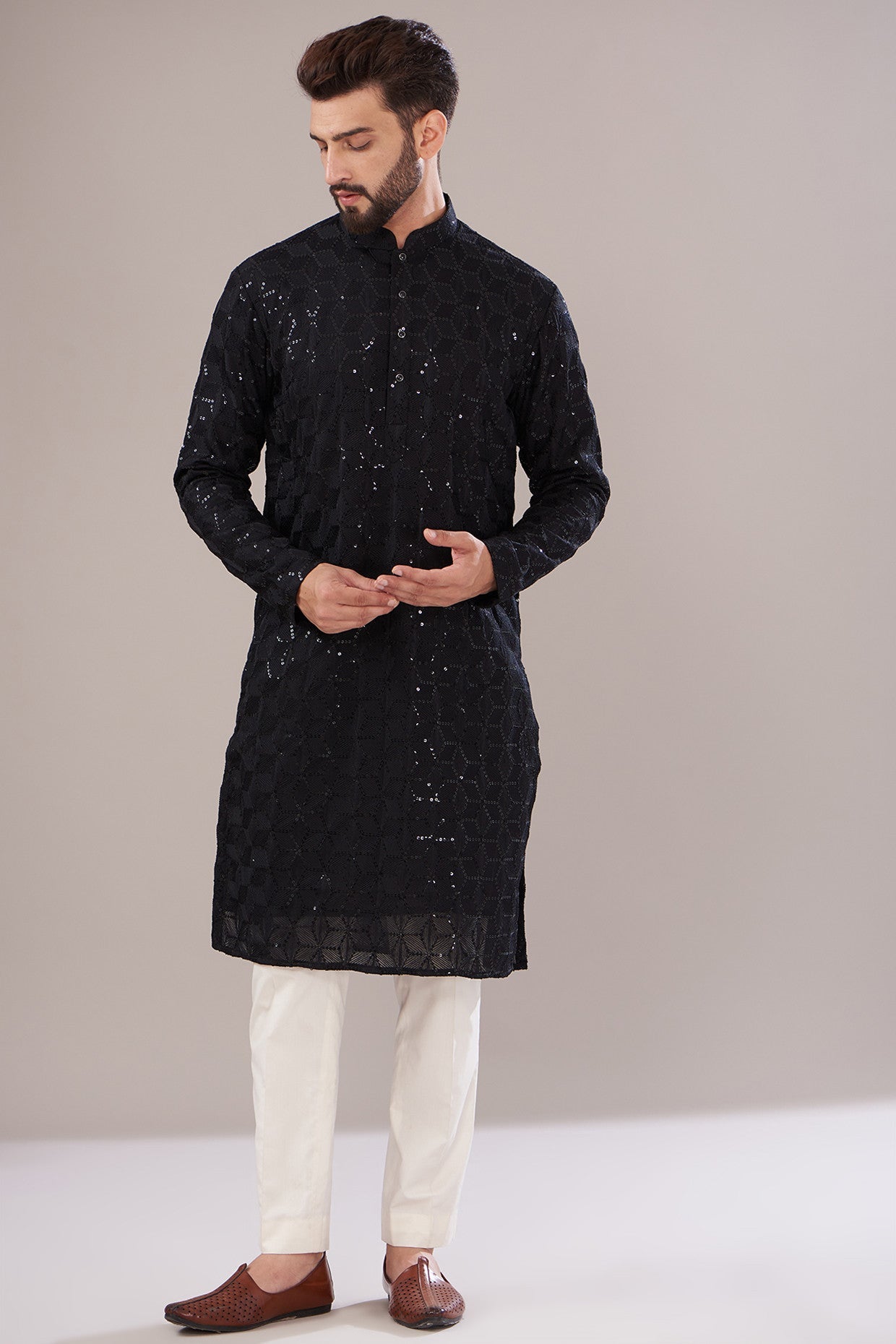 black and rust kashmiri embroidered chikankari kurta with multi thread work
