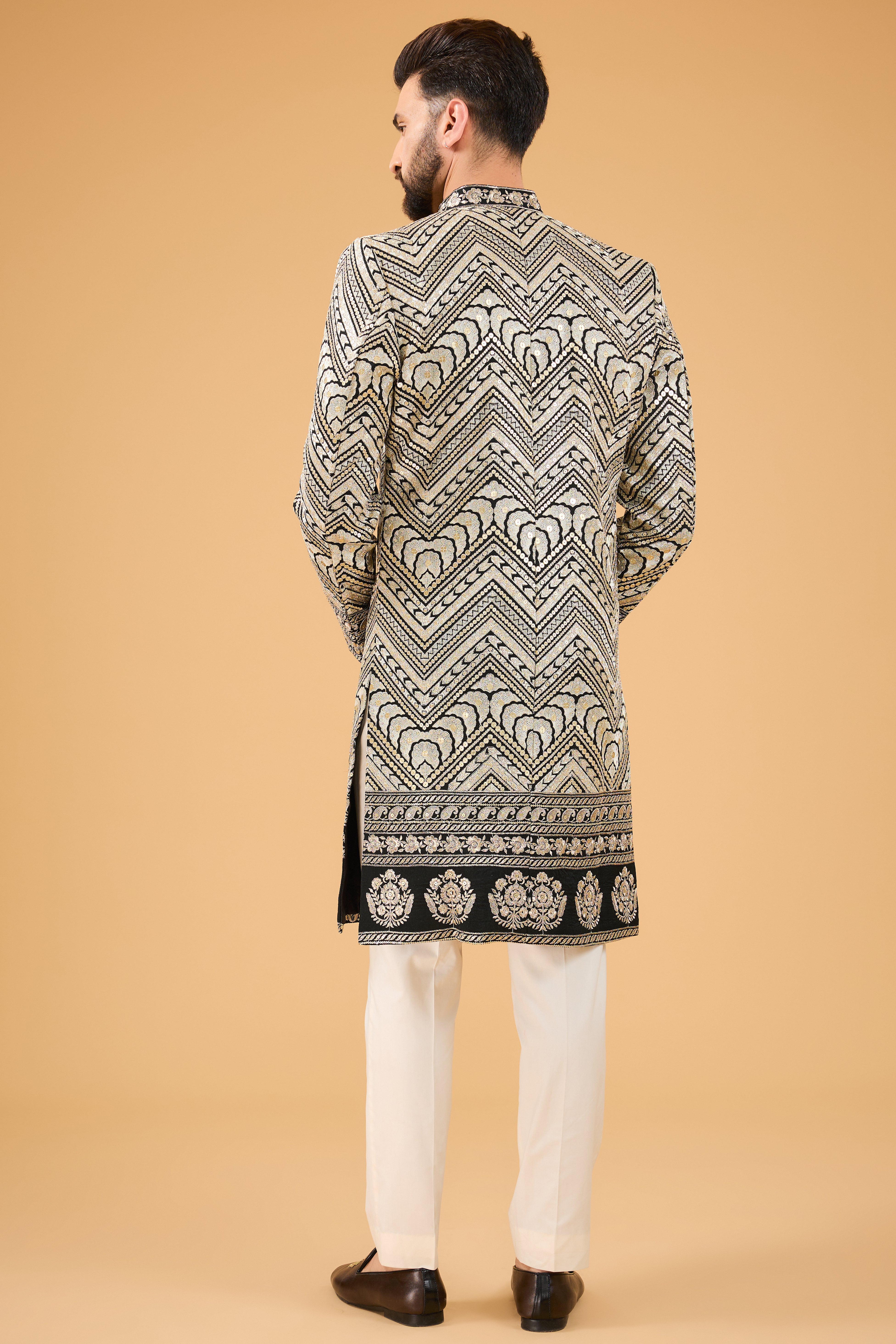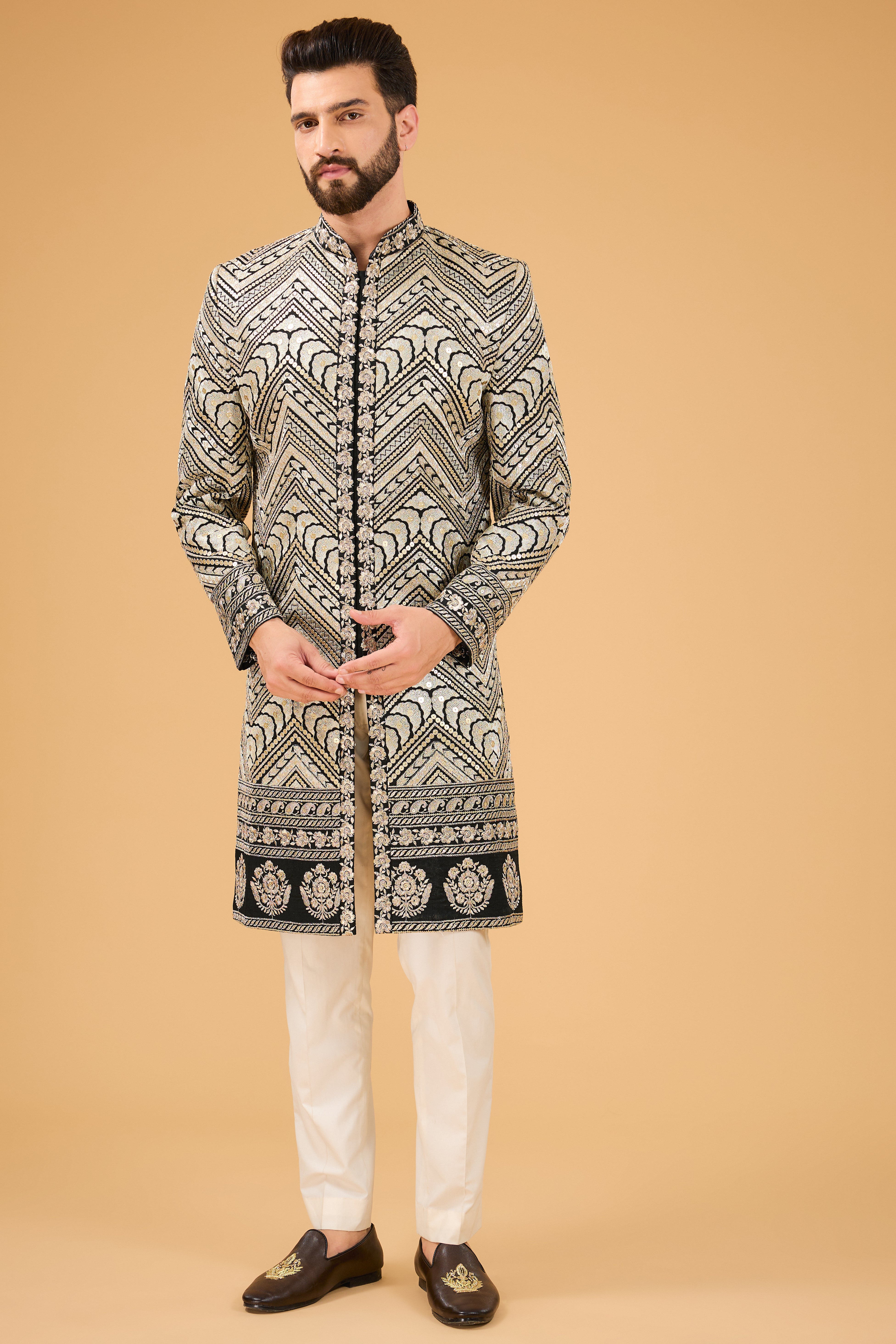 This black Sherwani showcases exquisite zari embroidry blending tradition with elegance. The intricate zari work is elevated by heavy sequence adding a sparkling effect.