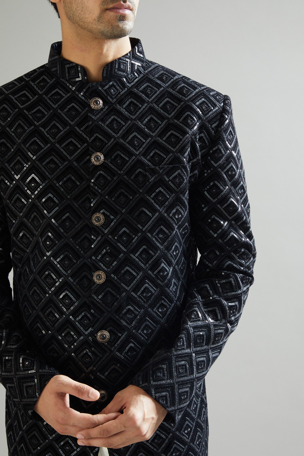 Featuring a black indowestern kurta in velvet base with embroidery. This contains only one piece.