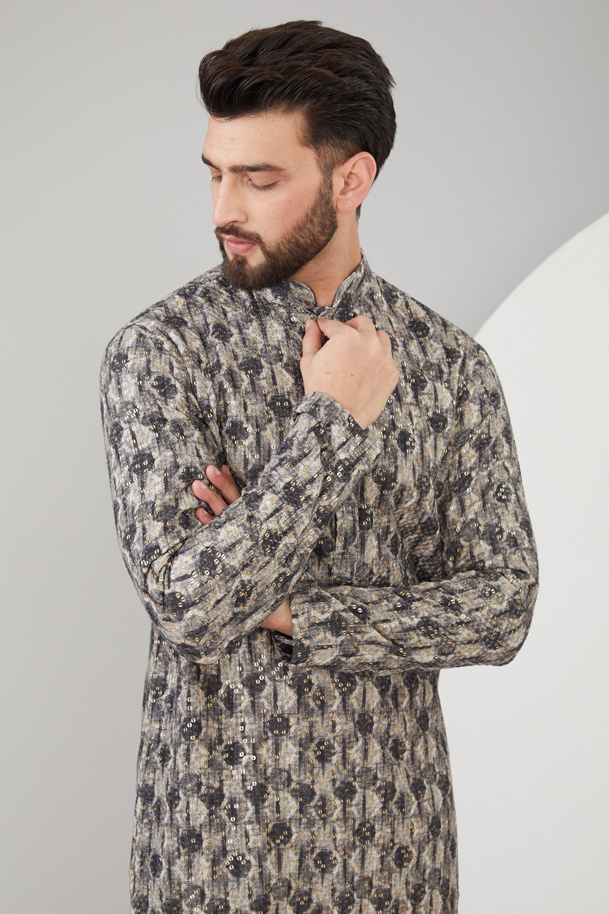 Featuring a black and grey kurta in georgette base with print and sequins embellishments. Perfect wear for a festive occasion or sangeet ceremony.
