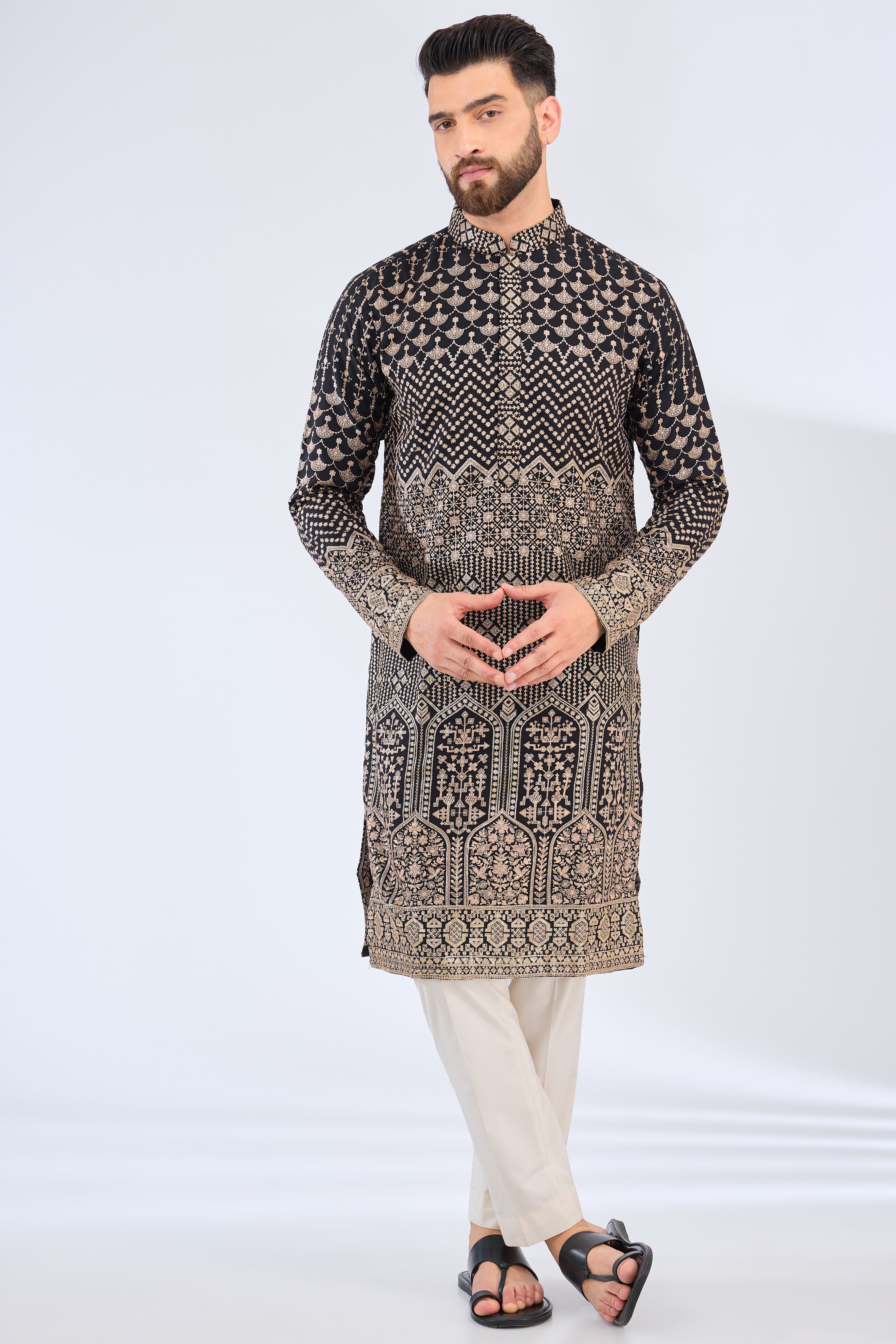A Dazzling Blend of Art and Attire this black kurta features detailed zari work and detailed ghera