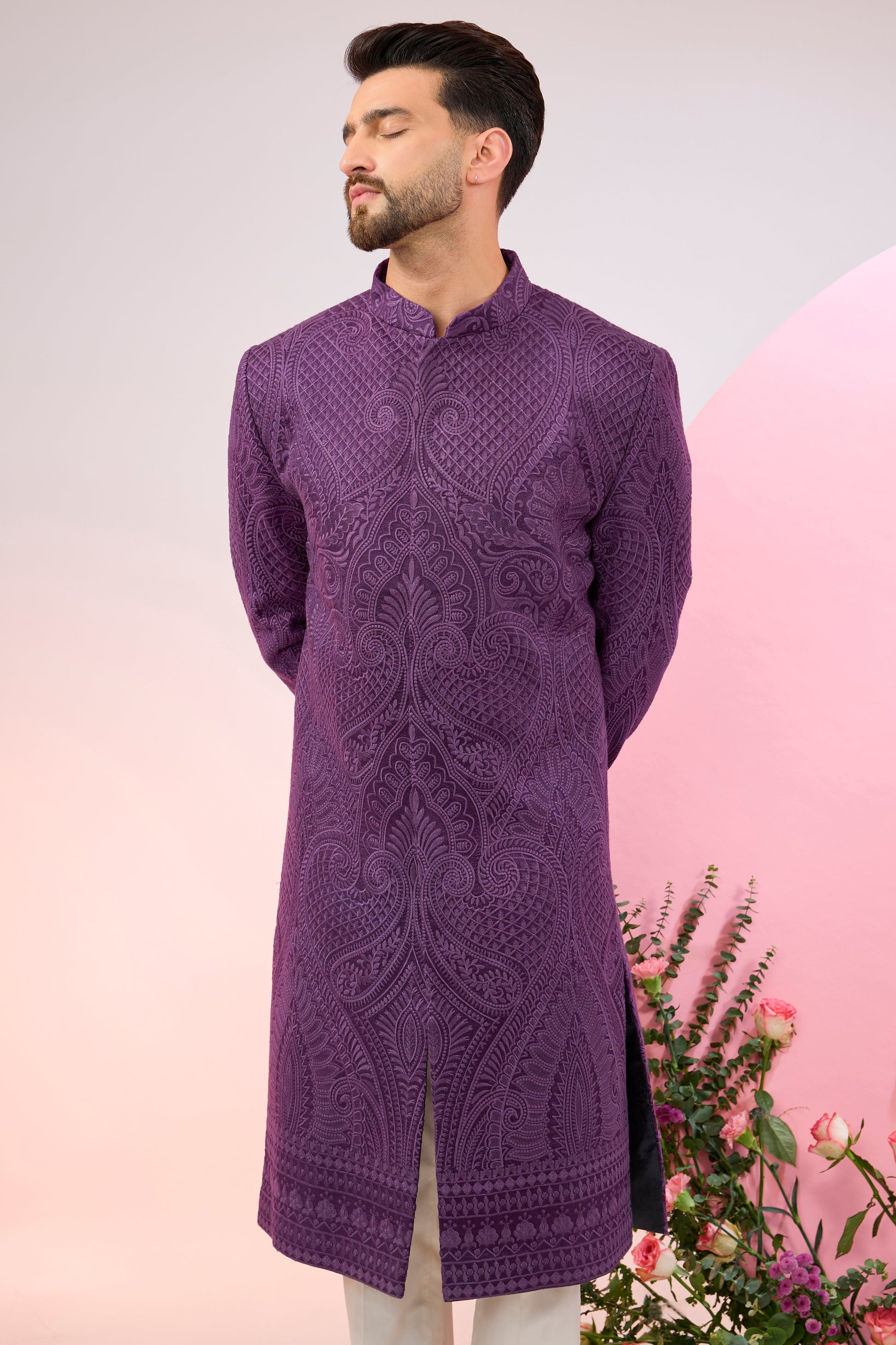 The purple ensemble with Kashmiri thread work and Jamawar embroidery is a luxurious blend of traditional elegance and intricate craftsmanship. The fabric, in a soft purple tone, serves as the perfect canvas for the elaborate embroidery that adorns it. This embroidery is spread gracefully across the fabric, adding a layer of texture and visual depth.