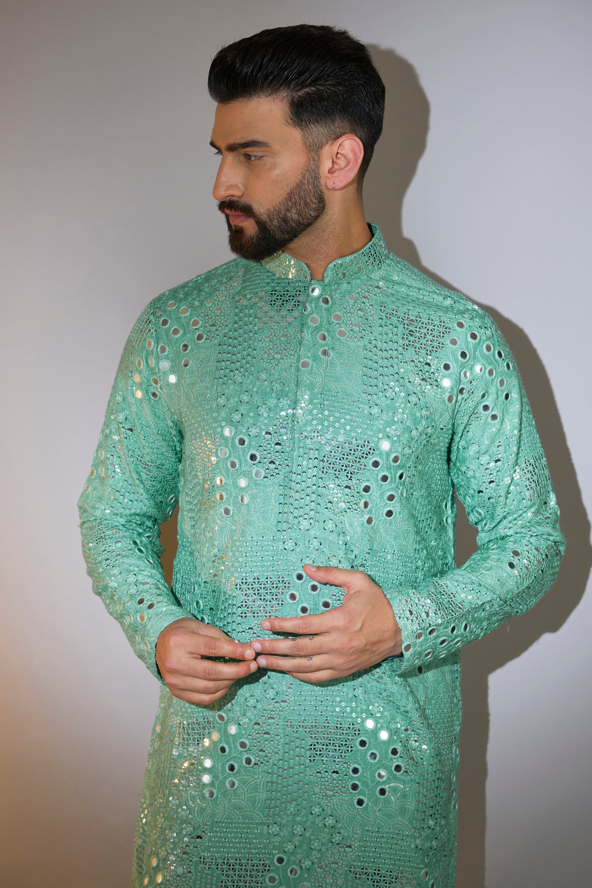 Discover the exquisite artistry of mirror work with our standout sage green kurta . Featuring elaborate thread detailing , sparkling sequins and the unique mirror detailing that enhances your silhouette, providing a dashing look for your ocassion .