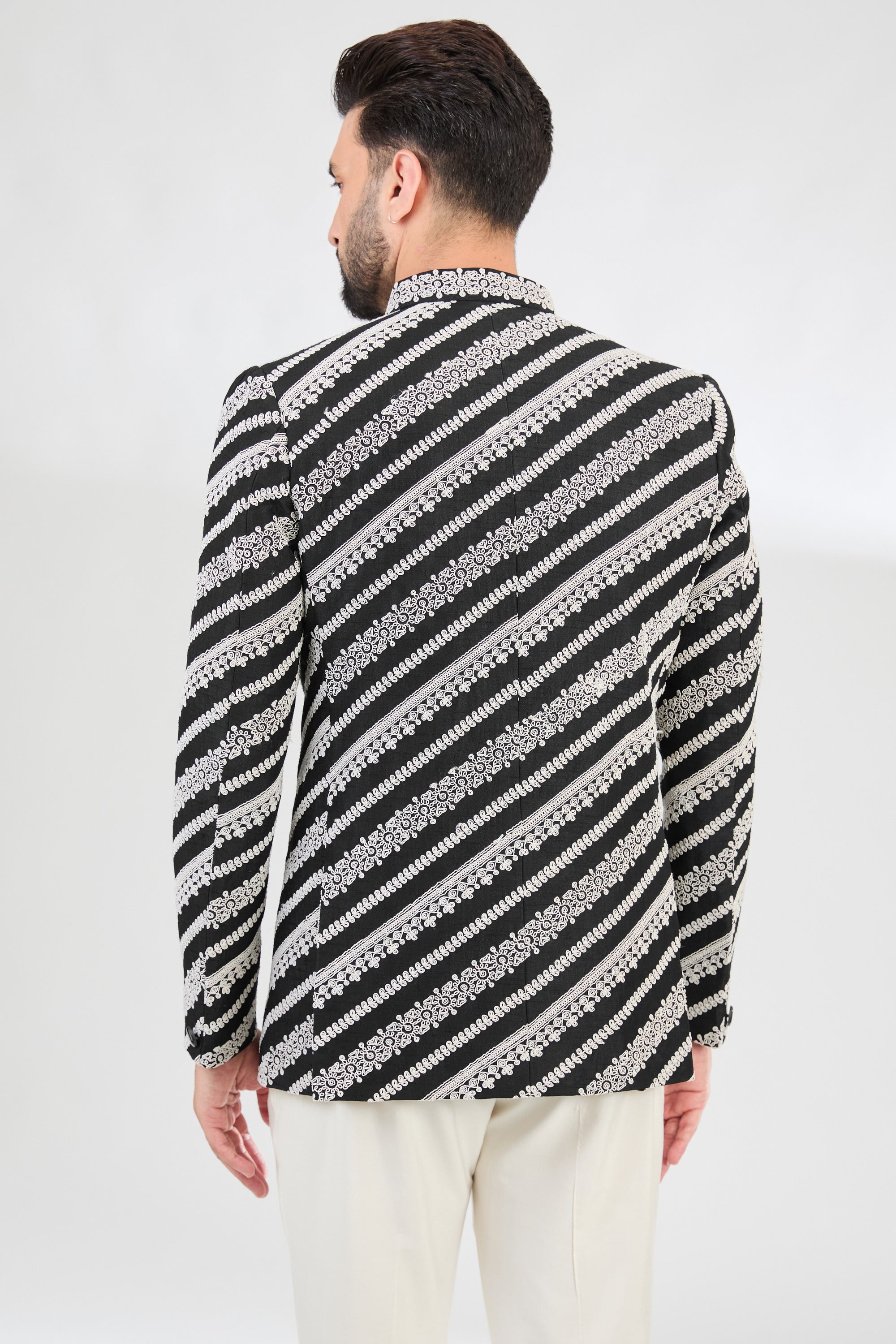 Crafted with exquisite precision, this signature black bandhgala adorned with intricate dori embroidery, makes it a majestic ensemble radiating timeless grandeur.