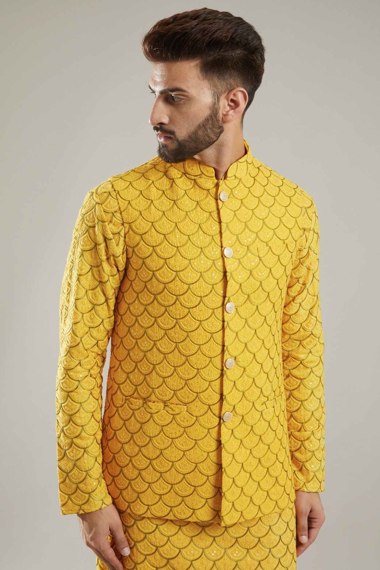 Featuring a yellow nehru jacket in silk base with embroidery. It is paired with a matching kurta.